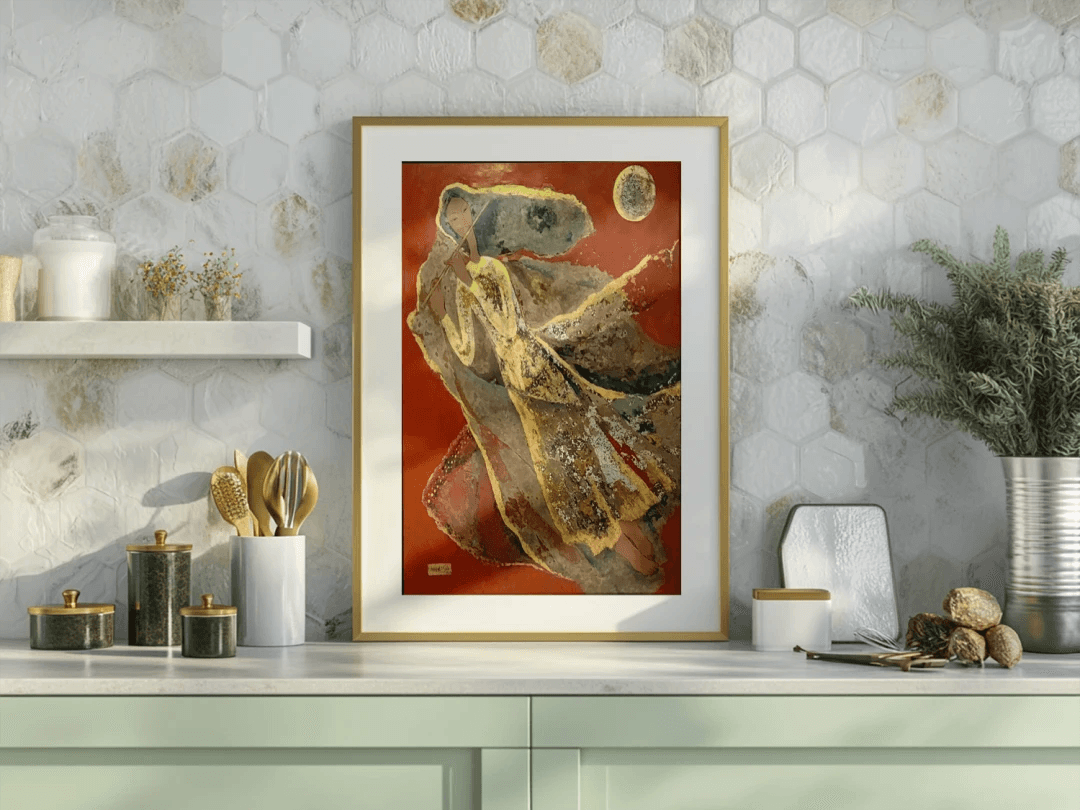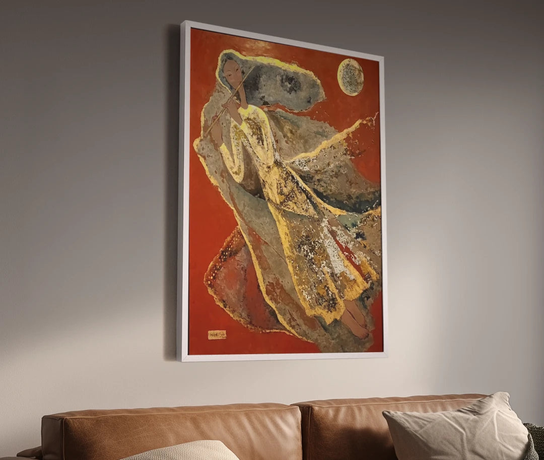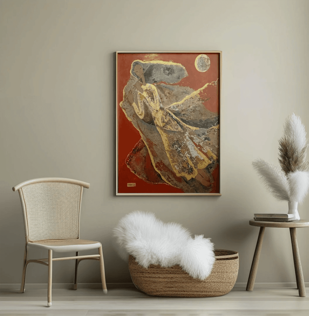 A single flutist moves across a red field under a round moon, her áo dài and veils rendered as stratified planes of lacquer that catch on seams of gold. The composition compresses depth, privileging contour, pattern, and reflected light. Buried tones emerge through cut back layers and polish, so the garment reads like shifting air. The circular moon locks the image, balancing the diagonal sweep of the figure and turning reflection into the work’s structural rhythm.