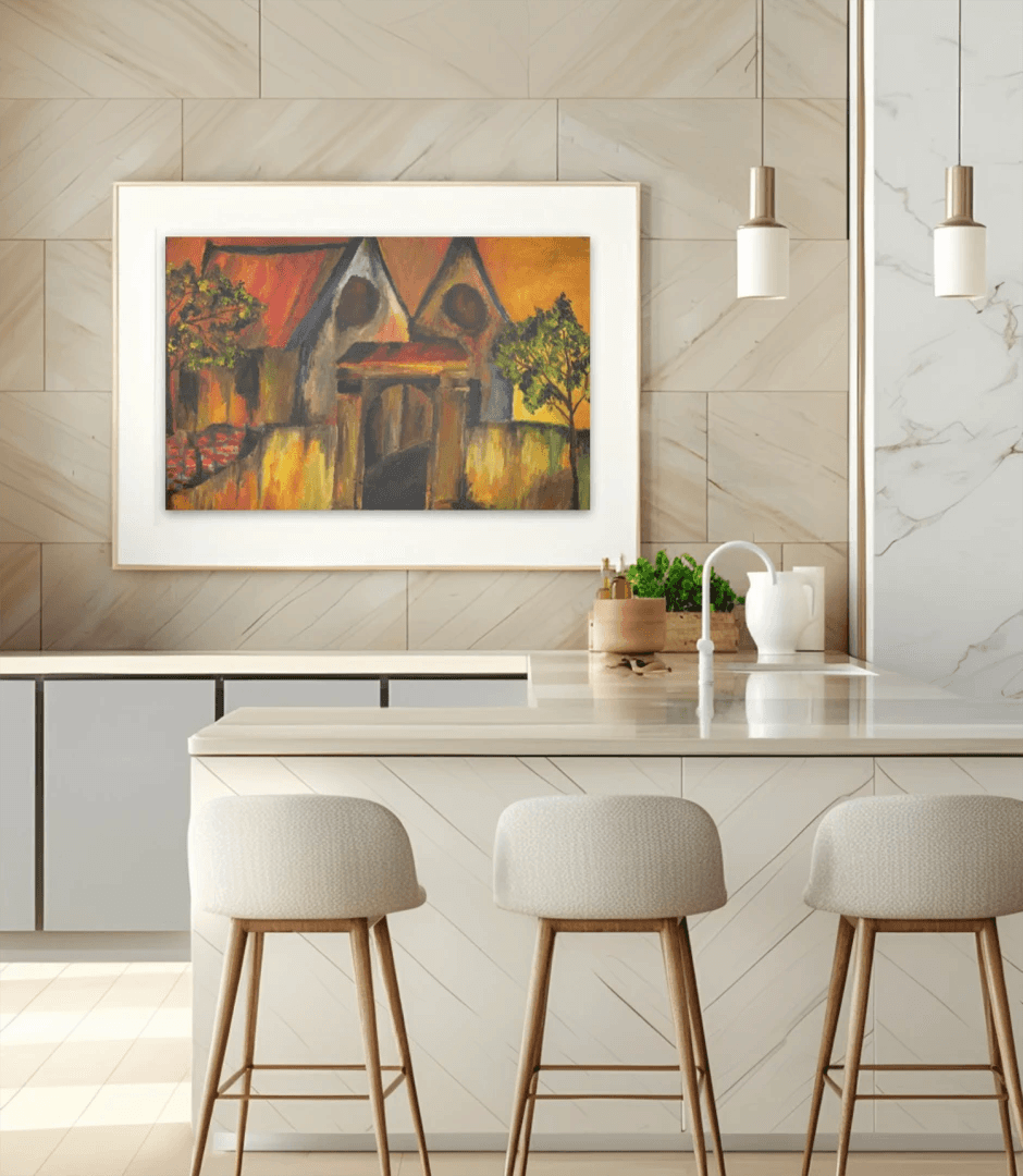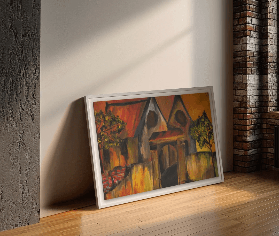 Warm ochres and red tile tones stage a compact streetscape, framed by two trees and a central gate. The roofs and wall planes are simplified into clear blocks, so depth reads shallow and rhythmic rather than panoramic. The palette echoes the yellow façades and tiled roofs that characterize Hoi An’s old quarter, where historic merchant houses and assembly halls form a continuous streetscape.