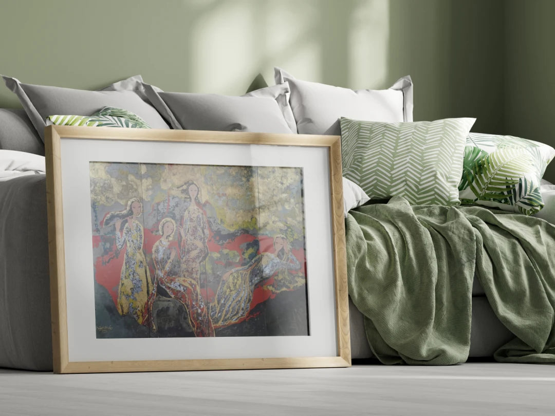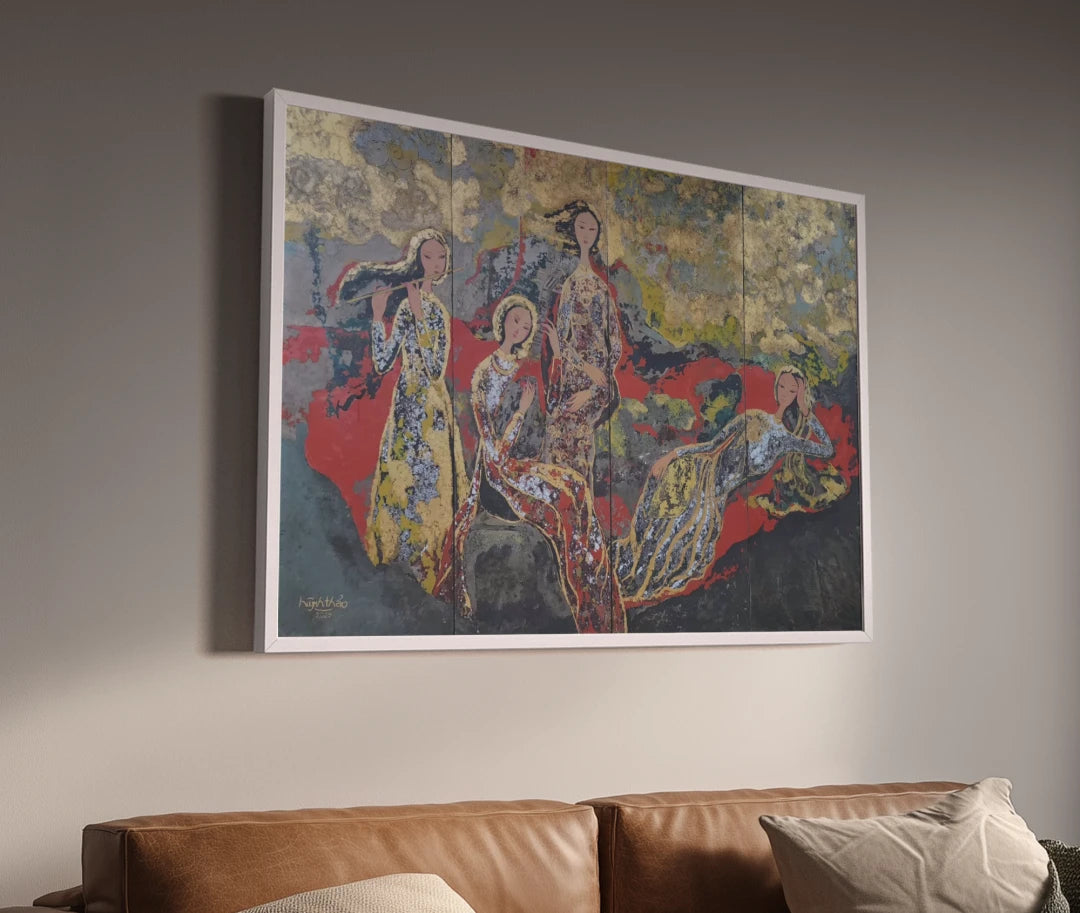 Working with natural resin, gold leaf, and vermilion, Huynh builds luminous, layered surfaces that carry cultural memory into contemporary life. Her paintings often center women in the áo dài, rendered with restraint and quiet allure. As she notes, “I use traditional lacquer materials in a style entirely my own,” and “I pour into my works what is softest, filling them with grace, gentleness, and allure.” The figures retain a discreet, deeply Asian character while speaking in a living, evolving visual language.
