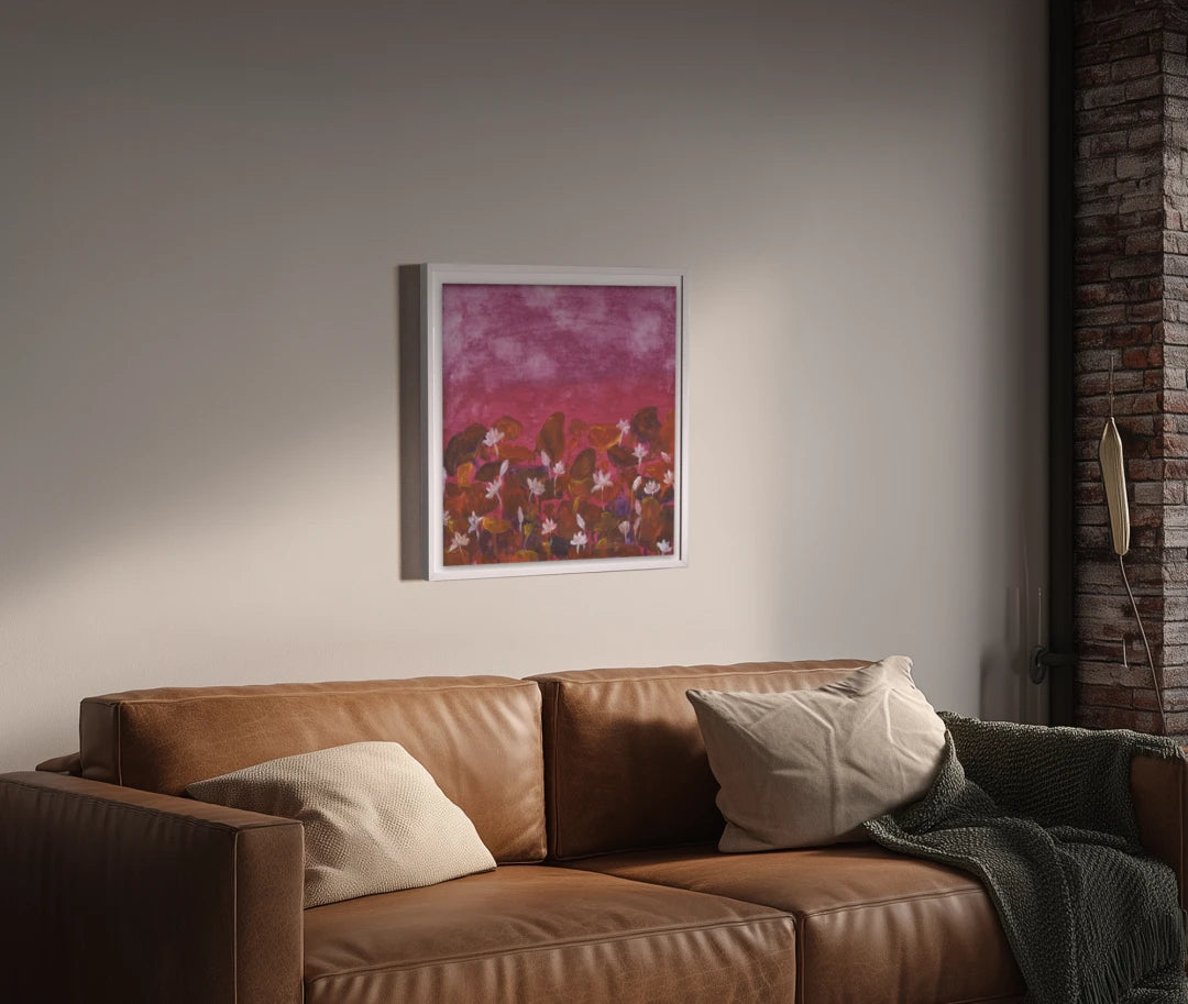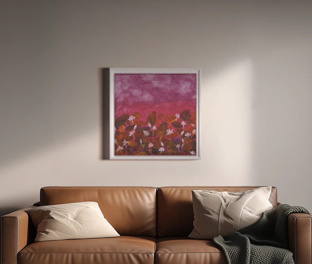 A low band of lilies and dark pads fronts a wide magenta sky, the blossoms picked out in small white notes against rust and violet foliage. Acrylic sits in thin, chalky veils through the sky, then thickens into shorter strokes around the leaves, so space reads as two fields held in tension rather than deep perspective. The composition keeps the horizon low and the flowers upright, letting color temperature carry the scene from cool rose to warmer reds near the waterline.