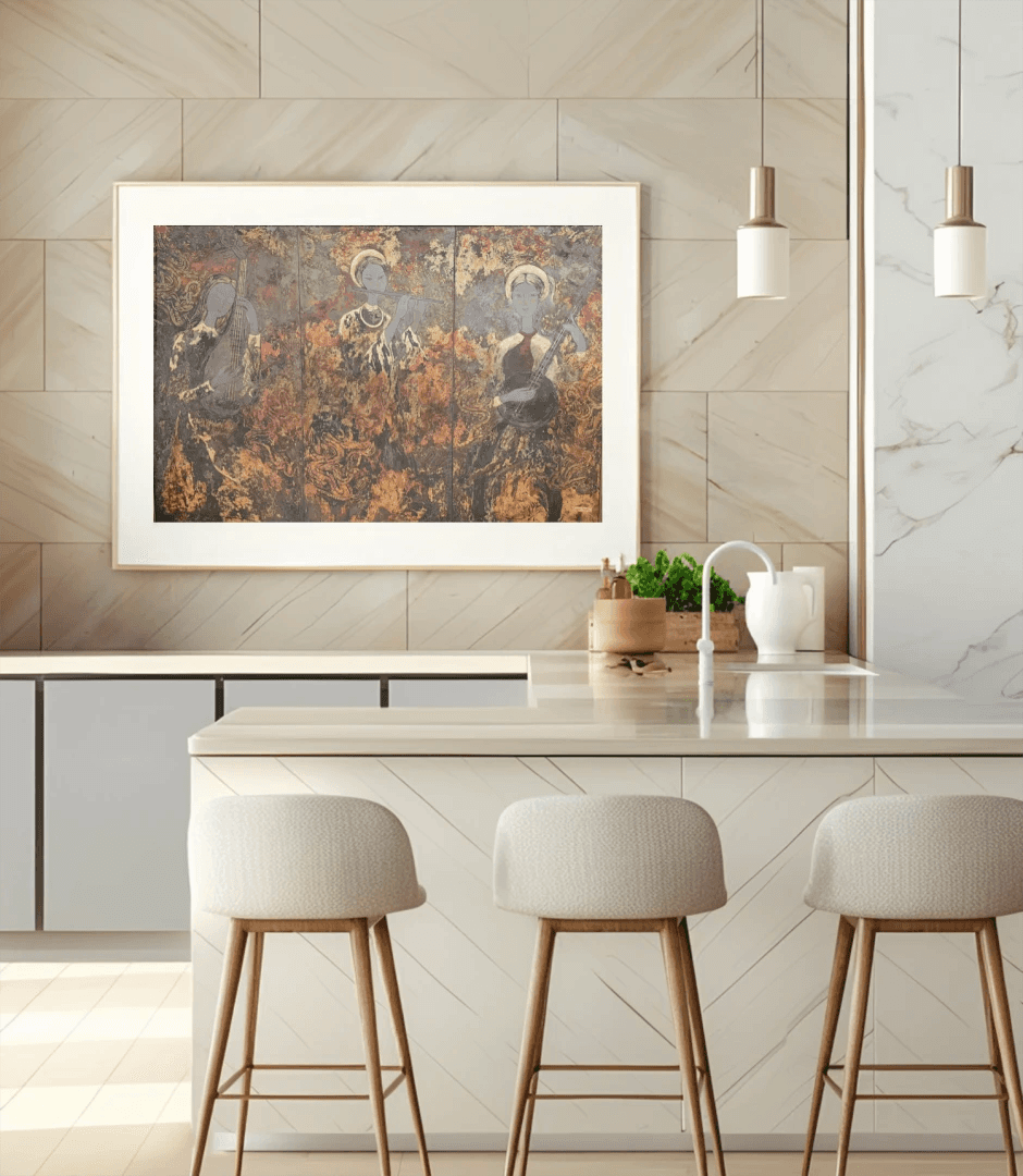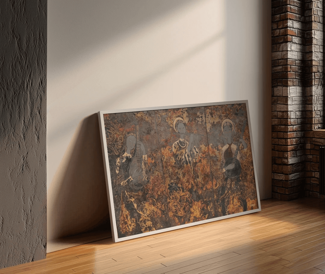 A three panel ensemble of women musicians holds the picture plane, their simplified faces and measured poses set against a turbulent ground of red, umber, and gold. Instruments and hands are drawn with crisp contour, while garments dissolve into patterned fields that catch and return light. The surface is constructed in successive coats of lacquer, then cut back and polished so seams of gold leaf and buried pigments appear like traces of memory. The evenly warmed palette binds figures and ground, allowing reflection to function as a narrative device rather than ornament.