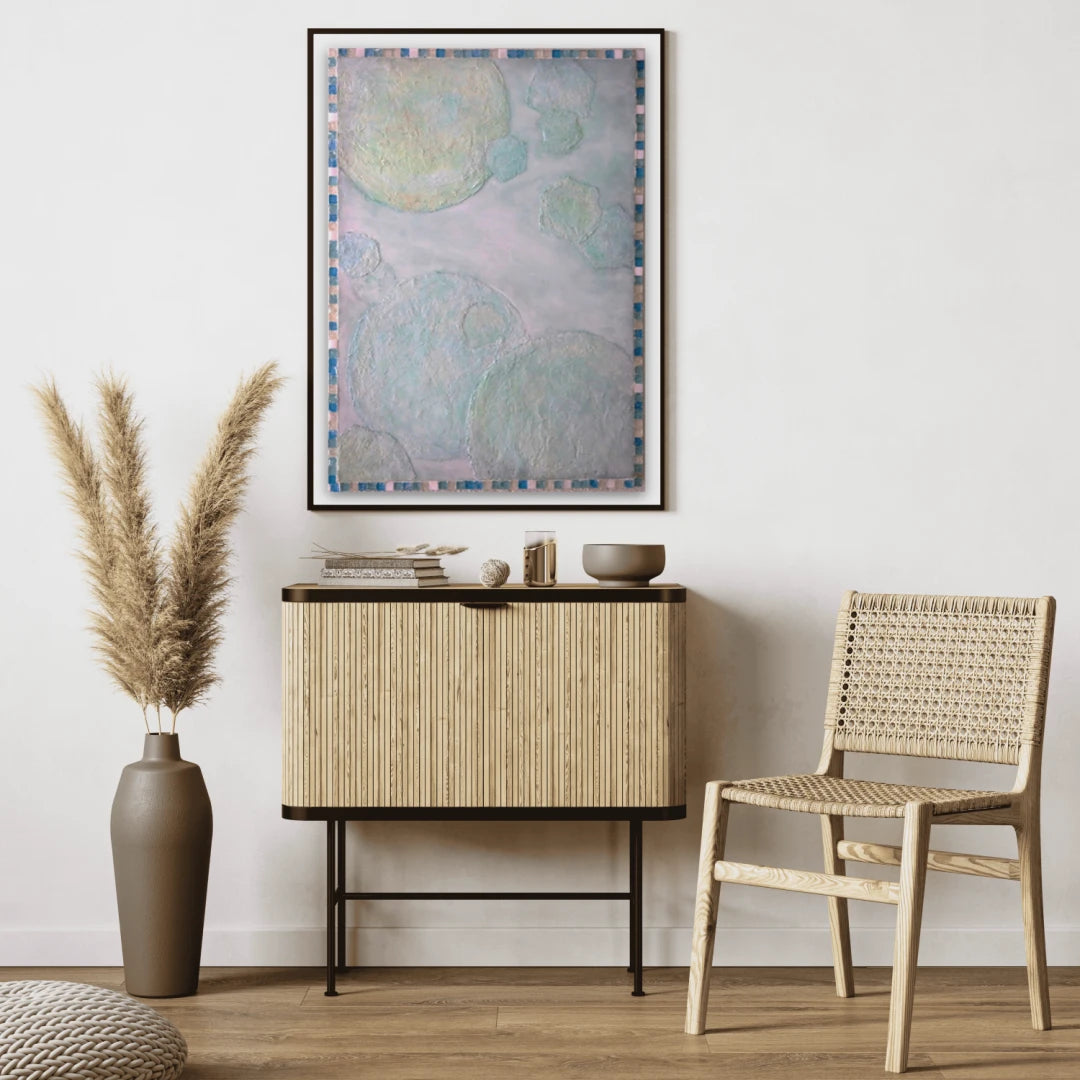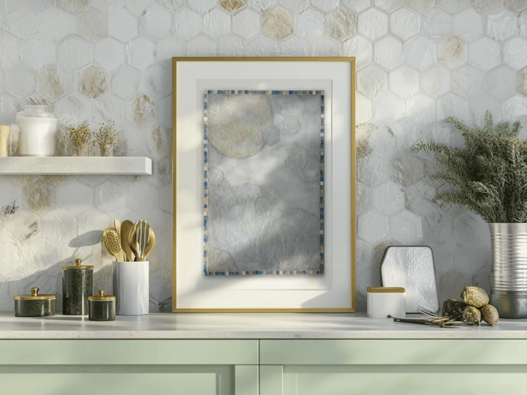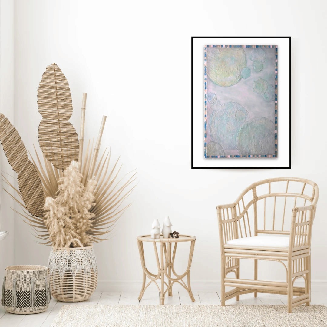 Soft blue green disks float in a pale field, their edges raised and abraded, while a hand set border of small square tiles encloses the image. Watercolor lays translucent veils, mosaic tesserae add texture and structure, so surface and frame feel physically protected. In mosaic practice, tesserae are small pieces of stone, glass, or ceramic cut to regular shapes and set to form a unified skin, a construction logic echoed by the tiled perimeter here.