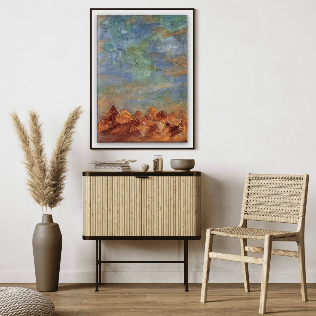 A serried line of rust colored peaks rises along the lower edge while the sky occupies most of the small canvas, broken by cool blue and sage washes that settle into granular textures. The horizon sits low, so the mountains read as a compact emblem against a shifting atmospheric field. The title Shan, from the Chinese 山 meaning mountain, makes the motif explicit, and the Kashmir note places those forms within a region ringed by the Pir Panjal and Greater Himalayan ranges.