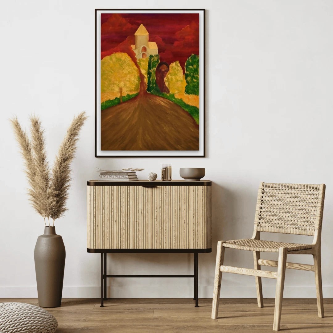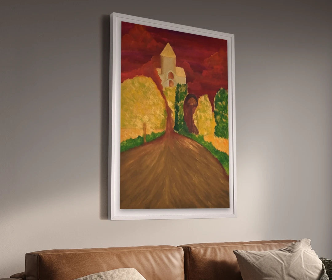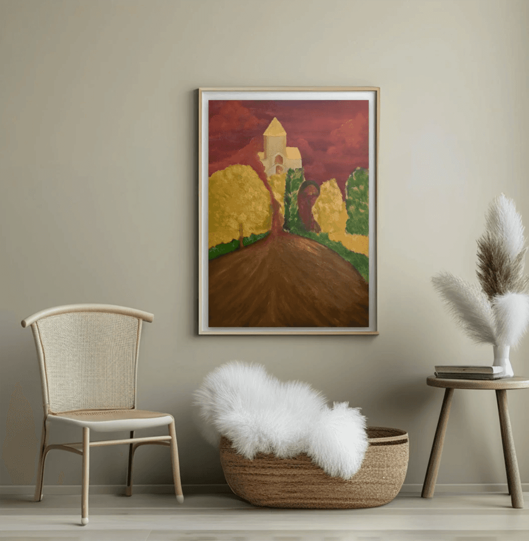 A road pulls inward between gold canopies toward a pale church set under a crimson sky. Watercolor sits in dense, velvety layers, so trees read as textured blocks and the avenue becomes a single, directional plane. The sky’s stacked reds compress depth, pushing architecture and foliage forward into the same register. The title evokes the idiom where sky and earth meet at the horizon, an image of distance and longing that here becomes a fixed, central vanishing point. The scene draws on Tbilisi in autumn, when boulevards line with yellow leaves, and on Georgian ecclesiastical silhouettes with their tapering volumes and conical roofs. These references situate the work without literal specificity.