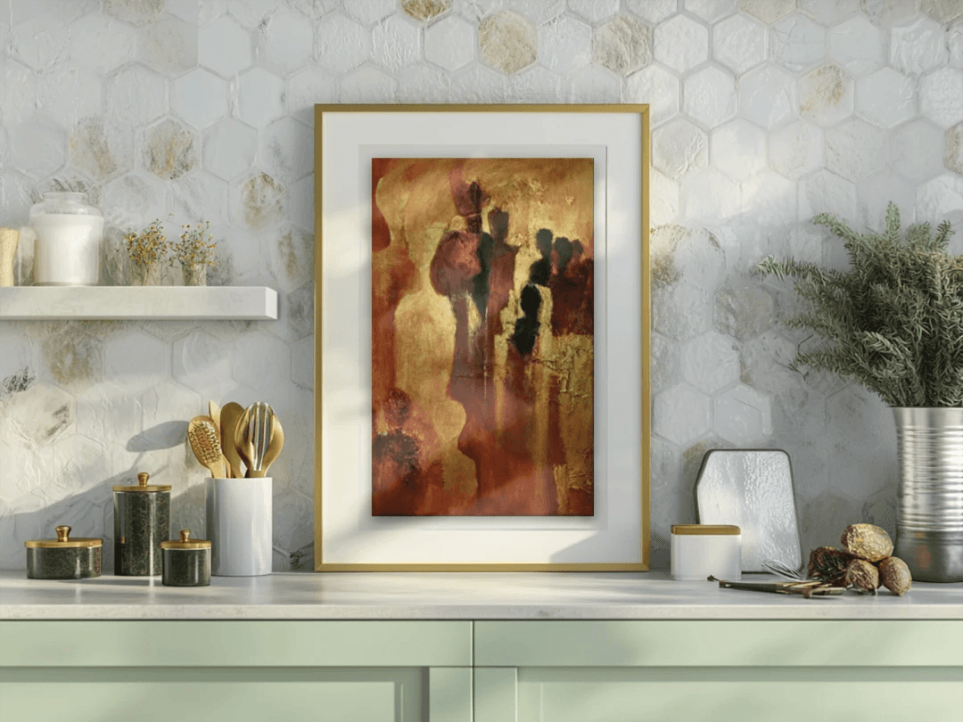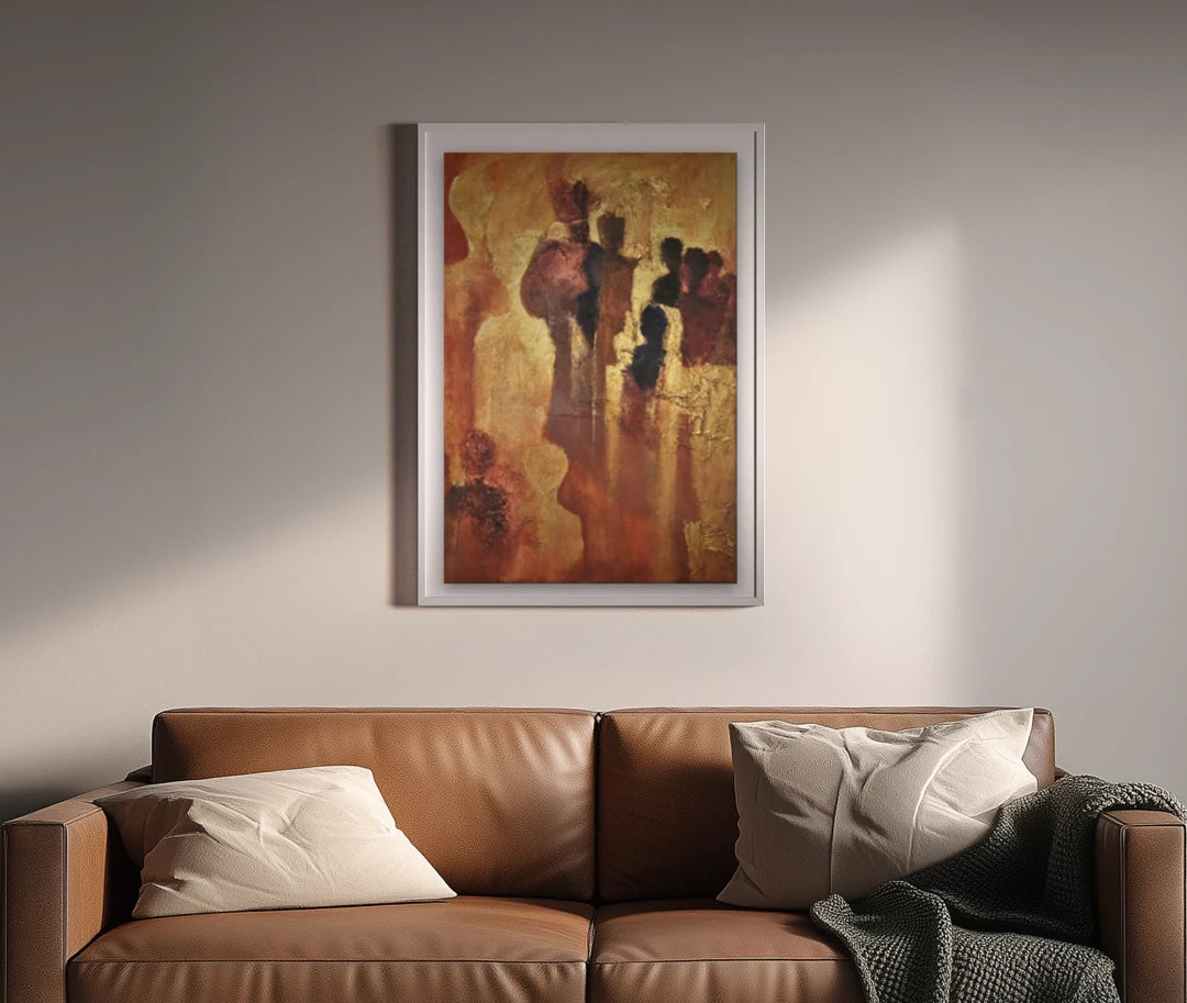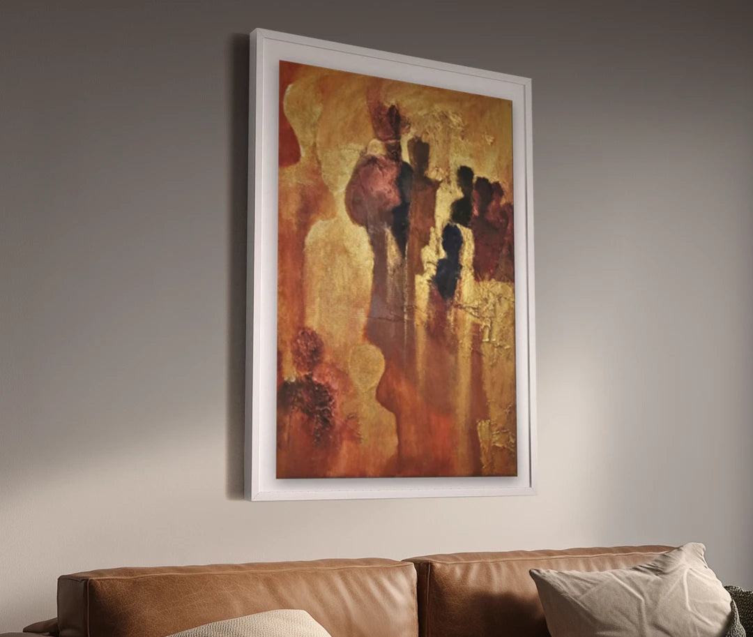 Grouped silhouettes rise from a field of ochre and rust, their bodies softened into vertical drifts of light and shadow. Backlighting flattens depth and fuses figure with ground, while scraped highlights and warm washes turn the surface into a single radiant plane. Gold toned passages recall the art historical use of gold to signify sacred presence and transcendent light, especially in Byzantine icons and mosaics, which used luminous grounds to lift human figures into a spiritual register.