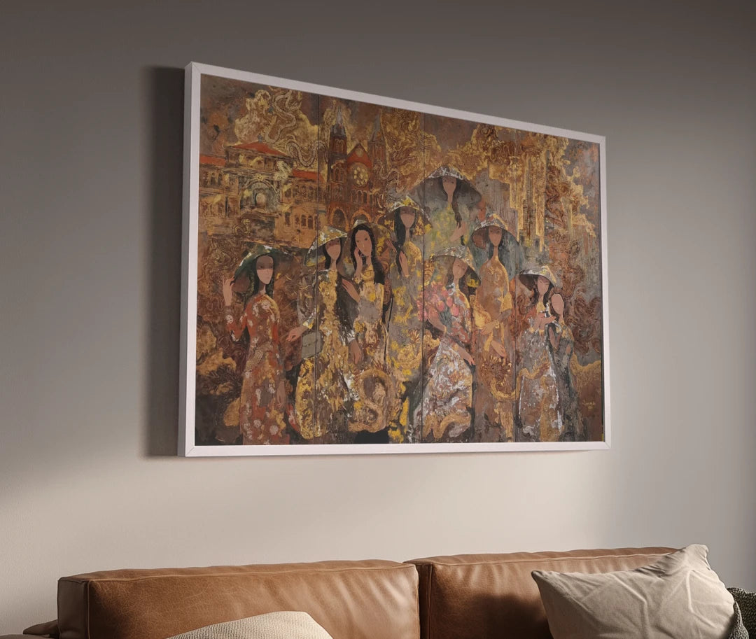 A multi panel composition stages a procession of women in áo dài before a palimpsest of Ho Chi Minh City landmarks, where historic facades and modern skylines share the same pictorial field. The lacquer surface is built in successive layers, then cut back, sanded, and polished to reveal buried tones and seams of gold leaf that thread through the scene like memory lines. Figures and architecture are held in the same warm register, so no single element dominates. The eye moves from reflective highlights across patterned garments to architectural silhouettes, reading time as a layered surface rather than a linear story.