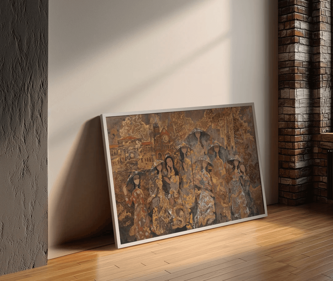 Working with natural resin, gold leaf, and vermilion, Huynh builds luminous, layered surfaces that carry cultural memory into contemporary life. Her paintings often center women in the áo dài, rendered with restraint and quiet allure. As she notes, “I use traditional lacquer materials in a style entirely my own,” and “I pour into my works what is softest, filling them with grace, gentleness, and allure.” The figures retain a discreet, deeply Asian character while speaking in a living, evolving visual language.