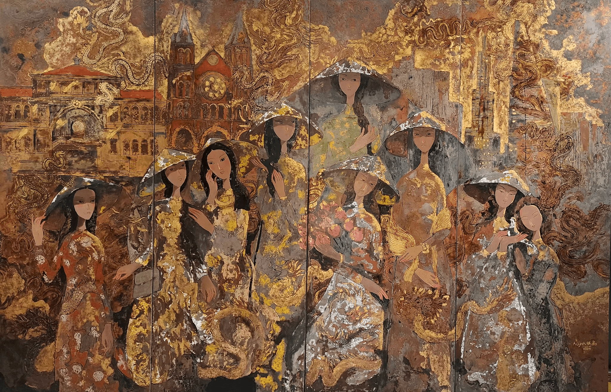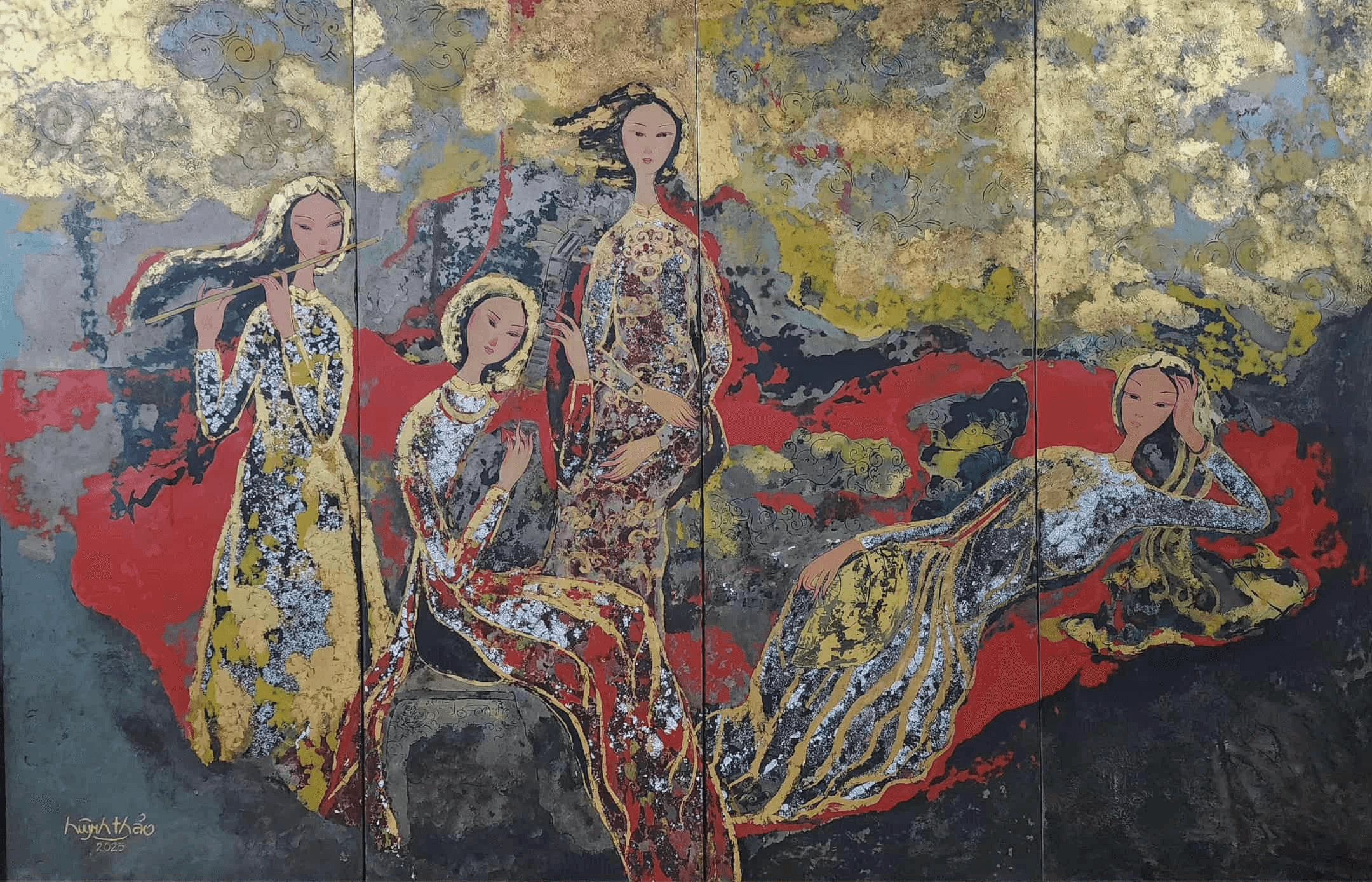 Working with natural resin, gold leaf, and vermilion, Huynh builds luminous, layered surfaces that carry cultural memory into contemporary life. Her paintings often center women in the áo dài, rendered with restraint and quiet allure. As she notes, “I use traditional lacquer materials in a style entirely my own,” and “I pour into my works what is softest, filling them with grace, gentleness, and allure.” The figures retain a discreet, deeply Asian character while speaking in a living, evolving visual language.